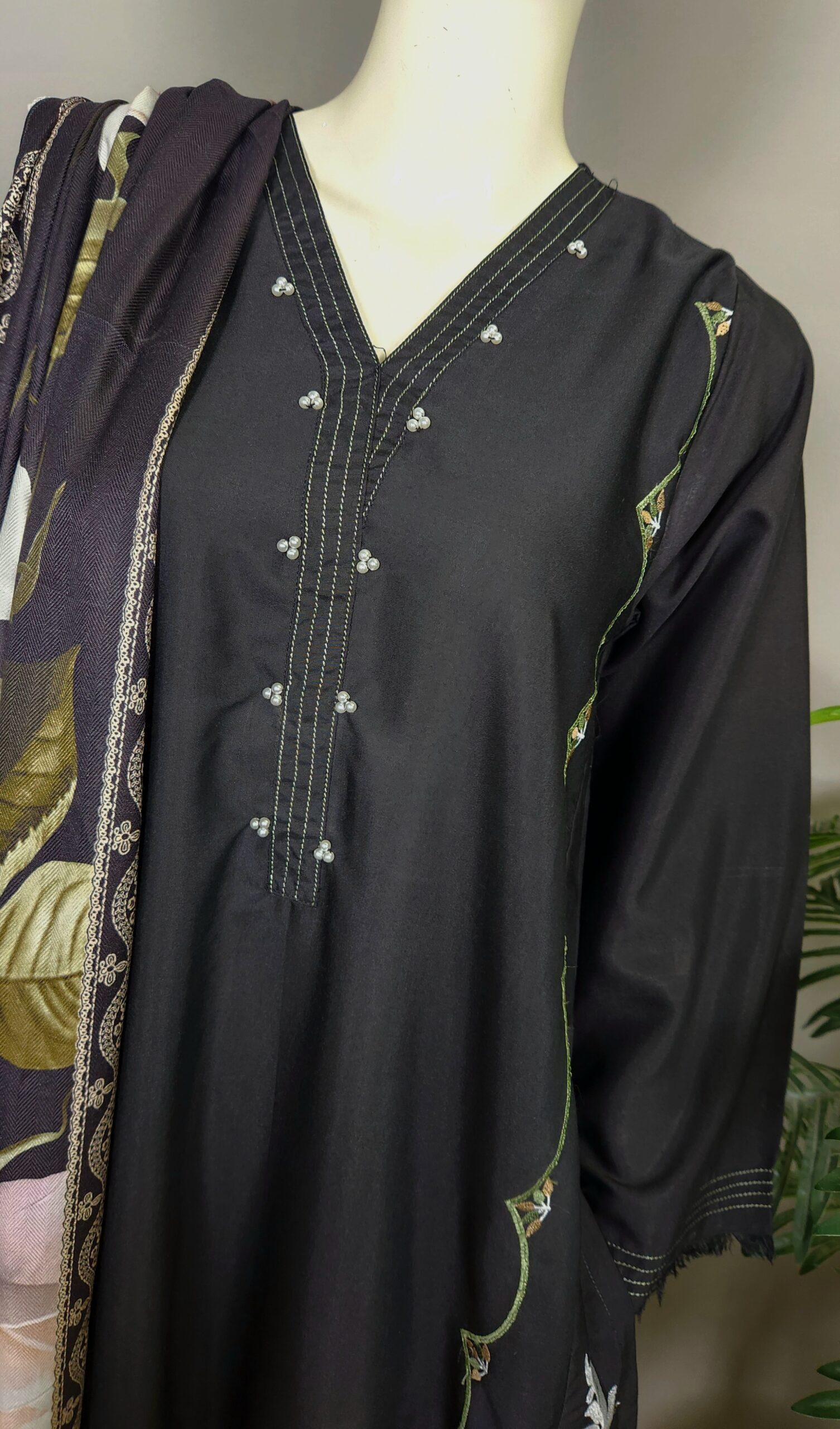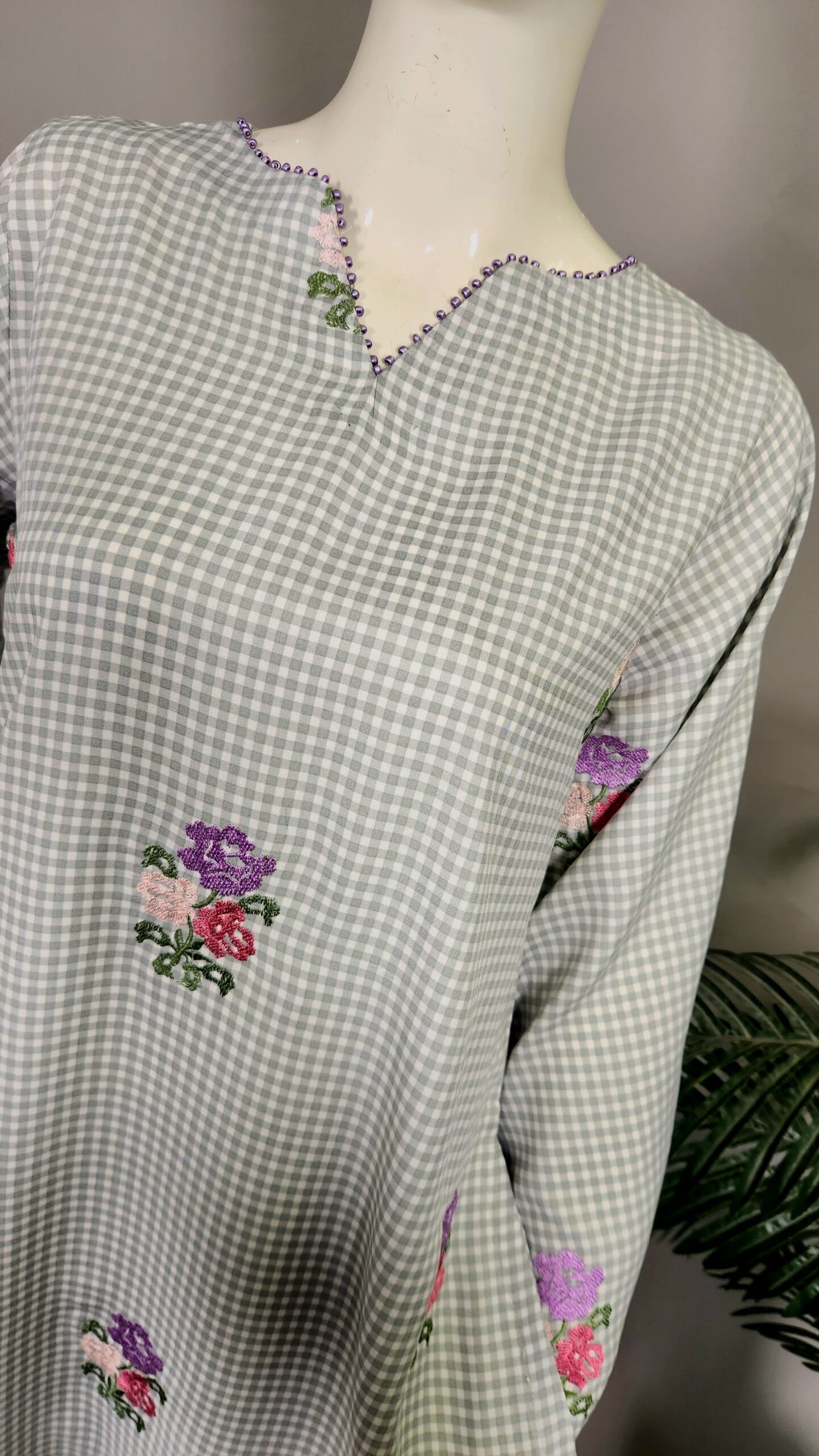 Hand work on neckline